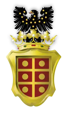 • Shield: Gules, a doubled cross Or between six bezants within a bordure of the second.[2]
