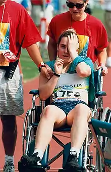 ![]() Australian athlete Marsha Green is assisted from the track at the 1996 Atlanta Paralympic Games | ||||||||||||||||||||||||||||||
