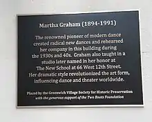 On June 9th 2013, The Greenwich Village Society for Historic Preservation unveiled this plaque at 66 Fifth Avenue where Graham had her studio in the 1930s and 40s.