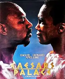 Hagler was initially reluctant to fight Leonard, announcing in July 1986 that a fight with Leonard wouldn't happen as he was "seriously thinking of retirement."[5] By the following month, Hagler had a change of heart and agreed to face Leonard in 1987.[6] Hagler was guaranteed $12 million plus a percentage of the revenue, while Leonard was guaranteed $11 million plus 50 percent of the closed circuit television rights in Maryland and the District of Columbia. Hagler ended up with around $20 million and Leonard with around $12 million.