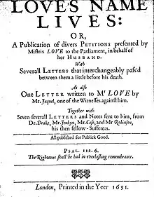- ↑ Love, Mary; Love, Christopher (1651). Love's Name Lives, Or, A Publication of Divers Petitions Presented by Mistris Love to the Parliament in Behalf of Her Husband: With Severall Letters that Interchangeably Pass'd Between Them a Little Before His Death : as Also One Letter Written to Mr. Love by Mr. Jaquel, One of the Witnesses Against Him : Together with Seven Severall Letters and Notes Sent to Him from Dr. Drake, Mr. Jenkyn, Mr. Case, and Mr. Robinson, His Then Fellow-sufferers. printed in the yeer.