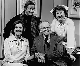 With cast of Doc. Standing, L-R: Irwin Corey and Mary Wickes. Seated: Elizabeth Wilson and Barnard Hughes (1975)