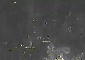 By convention these features are identified on lunar maps by placing the letter on the side of the crater midpoint that is closest to Maskelyne.