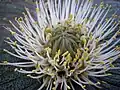 Massonia pustulata, the blistered massonia, is a species of flowering plant in the family Asparagaceae, subfamily Scilloidiae, native to the Western Cape of South Africa. Growing to 10 cm (3.9 in) tall and broad, it is a small bulbous perennial with two horizontal, opposite leaves, and virtually stalkless cream or pink flowers in winter. The stamens are longer than the perianth, giving the flower the appearance of a rounded, spiky brush-head.[3] The deep “pock marks” on the leaves give the plant its common name, as well as the specific epithet pustulata.