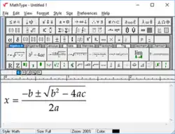 MathType is a graphical editor for mathematical equations, allowing entry with the mouse or keyboard in a full graphical WYSIWYG environment.[2] This contrasts to document markup languages such as LaTeX where equations are entered as markup in a text editor and then processed into a typeset document as a separate step.