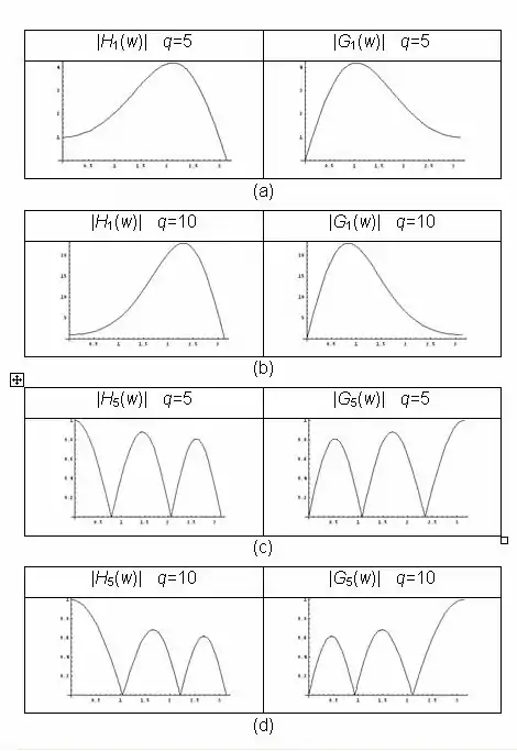 Figure 2 - Magnitude of the transfer function for Mathieu multiresolution analysis filters. (smoothing filter and detail filter for a few Mathieu parameters.) (a) , q=5, a = 1.85818754...; (b) , q = 10, a = −2.3991424...; (c) , q = 10, a = 25.5499717...; (d) , q = 10, a = 27.70376873...