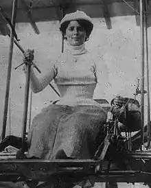 In an article published in Colliers Magazine in September 1911, Franck presents her impressions of her flights. The first was with Michel Effimoff who received a French licence on 15 February 1910.[3] A little later, she and her husband flew for an hour and a quarter with Henry Farman who sought to break the record for two passengers.[1] It was with the Farman brothers' manufacturing plant near Paris that Franck learned to fly. After establishing a record non-stop 14-mile flight at Mourelon, on 20 July 1910 she hoped to make a flight across the English Channel but was prevented by bad weather.[2]