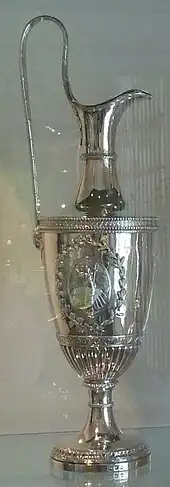 As part of Boulton's efforts to market to the wealthy, he started to sell vases decorated with ormolu, previously a French speciality. Ormolu was milled gold (from the French or moulu) amalgamated with mercury, and applied to the item, which was then heated to drive off the mercury, leaving the gold decoration.[33] In the late 1760s and early 1770s there was a fashion among the wealthy for decorated vases, and he sought to cater to this craze. He initially ordered ceramic vases from his friend and fellow Lunar Society member Josiah Wedgwood, but ceramic proved unable to bear the weight of the decorations and Boulton chose marble and other decorative stone as the material for his vases.[34] Boulton copied vase designs from classical Greek works and borrowed works of art from collectors, merchants, and sculptors.[34]