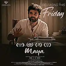Maya was screened at festival circuits during 2017, and it won the Best Short Fiction Award at the Chicago South Asian Film Festival held that year. However, the film was delayed due to various reasons, firstly Ani wanted to release the short only after his debut film Ninnila Ninnila, since he believed that the audience should connect with the similarities between two films.[4] Gautham Vasudev Menon acquired the rights to distribute the short film through his Ondraga Entertainment banner and shared the poster through social media handles on 16 May 2021.[5] The teaser of the short was unveiled on 22 May 2021 to positive response,[6] with the film being released on 11 June.[3] Ani further added that the revenue from the short film would be donated to COVID-19 frontline workers.[7]