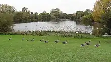 The southern end has two large lakes which are rich in wildlife, newly planted woodland and rough grassland.[2] The Mayes Brook runs along the western edge. There is access from Lodge Avenue.[1] 51°32′25″N 0°06′40″E / 51.5403°N 0.1111°E