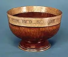 Ornamented types usually have a rim or "band" of precious metal, generally of silver or silver gilt; the foot and the print being also of metal.[7] There are examples with wooden covers, sometimes with a metal handle, such as the Bute Mazer or Flemish and German mazers in the British Museum. On the outside, but generally not the inside of the metal band there is often an inscription, religious, or convivial, and the print was also often decorated with a sculpted or engraved plare, and sometimes a gem.[8] The Bute Mazer is one of the most elaborate to survive, with a three-dimensional reclining lion rising from the base, and enamelled coats of arms in a circle around it. Saints, the religious monogram IHS, and animals, often no doubt with heraldic significance, are other common decorations of the boss. Many metal pieces that appear to be mazer bosses have been excavated.[9] An example from York Minster grants an indulgence of 40 days remission from Purgatory for all who drink from it.[10]