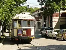 Car 122 was built to a standard American design by the J. G. Brill Company of Philadelphia in 1909[2] for export to Porto, Portugal. Rosie is similar to early streetcars that once operated in Dallas. 122 was retired from service on the Porto streetcar system in 1978,[21] and was brought to the U.S. in the early 1980s by Gales Creek Enterprises (GCE), of Oregon, purchased by Portland businessmen Bill and Sam Naito for possible use on a then-proposed heritage streetcar line in Portland. GCE refurbished it at the Oregon Electric Railway Museum for use, on loan, in the first San Francisco Historic Trolley Festival, in summer 1983, and car 122 operated intermittently in service on San Francisco's Market Street in that year; it was painted yellow-and-cream,[22] the colors of its sponsor in the Trolley Festival, Eastman Kodak.[23] In fall 1984, No. 122 was sold to MATA, and it arrived in Dallas around the beginning of 1985. Having previously been refurbished for use in San Francisco, 122 only needed minor work to bring it into service on MATA's opening day. However, in the late 1990s car 122 received a more extensive restoration. Shortly afterward, 122 developed motor problems which kept it in the barn. These problems have been solved and 122 is currently the oldest streetcar in daily service in North America.[24]