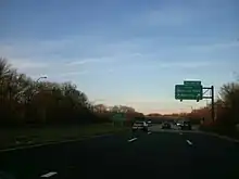 Construction began in May 1988, and the project was expected to be completed on October 31, 1991.[27][28][29] It was proceeding on schedule until lawsuit was filed in February 1989. The Appellate Division of the New York State Supreme Court ruled on that NYSDOT had to provide a new environmental report by May 12 of that year or face having the reconstruction shut down.[30] That December 19, the Court of Appeals announced their decision on the case of Village of Westbury v. Department of Transportation of the State of New York, et al., ruling in favor of Westbury. In its decision, the court stated NYSDOT should have issued a joint report for the interchange and widening projects because both projects improved the flow of traffic on the Northern State Parkway and were therefore related – although the widening portion of the project did not have a projected start date at the time the lawsuit was filed. The previous court's ruling was affirmed, and NYSDOT was advised to consider the environmental impacts of projects in the future on other, nearby projects.[31]