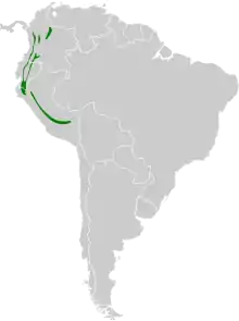 It is found in Colombia, Ecuador, and Peru. Its natural habitat is subtropical or tropical moist montane forests.