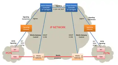 The Media Gateway Control Protocol (MGCP) is a telecommunication protocol for signaling and call control in hybrid voice over IP (VoIP) and traditional telecommunication systems. It implements the media gateway control protocol architecture for controlling media gateways connected to the public switched telephone network (PSTN).[1] The media gateways provide conversion of traditional electronic media to the Internet Protocol (IP) network. The protocol is a successor to the Simple Gateway Control Protocol (SGCP), which was developed by Bellcore and Cisco, and the Internet Protocol Device Control (IPDC).[2]