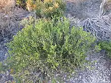 Melaleuca araucarioides is a small to medium tree, about 0.5–1.5 m (2–5 ft) high and wide with rough bark. Its leaves are fleshy and glabrous, about 2–6 mm (0.08–0.2 in) long and 1–2 mm (0.04–0.08 in) wide. They are crowded and arranged in groups of three forming six rows of leaves along the branches.[2][3][4]