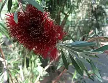The flowers are usually crimson but sometimes greenish-yellow. They are arranged in spikes on the ends of branches that continue to grow after flowering and also on the sides of the branches. The spikes are 45–65 mm (2–3 in) in diameter with 30 to 90 individual flowers. The petals are 3.5–6.9 mm (0.1–0.3 in) long and fall off as the flower ages and there are 27-45 stamens in each flower. Flowering occurs in summer and is followed by fruit that are woody capsules, 3.9–7.5 mm (0.2–0.3 in) long.[2][4]