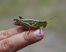 A relatively large species with sizes ranging from 30 to 55 mm.[4] A pair of pale yellow stripes running along the top of its body from above its eyes to the hind tip of its wings help to easily identify this species. This characteristic also gives this species its other common name the yellow-striped grasshopper.[4] The species also has a yellowish green coloration throughout its body due to chromoprotein and carotenoid.[5] The rest of the body looks similar to that of most grasshopper species, with enlarged hind legs for jumping and two pairs of wings, with one set overlapping the other.
