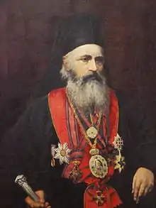 In 1864, following the consolidation of a single Orthodox church for the Principalities, he was placed in the new position of Bishop of the Lower Danube, in an acting capacity; the following year, through a decree signed by Domnitor Cuza, he took on the position on a permanent basis.[2] His see was located at Ismail, where for the next fourteen years he organized the diocese and paid close attention to improving the seminary.[8] In February 1868, Melchisedec and Ioan C. Cantacuzino were sent by Domnitor Carol I on a special mission to Saint Petersburg, to discuss the upgrading of Romania–Russia relations.[9][10] They handed Tsar Alexander II a letter from Carol and asked to negotiate unresolved political matters—such as reducing the special protections of Russian subjects on Romanian soil.[9] In a letter sent to the Domnitor earlier the same year, Otto von Bismarck, who had previously served as ambassador to Russia, expressed his confidence in the bishop's success. Indeed, he was well received by Russian officials, including the tsar, who kissed his hand out of respect.[10] While there, Melchisedec also tried to persuade Alexander Gorchakov to mediate between his church and the Ecumenical Patriarchate, in order to resolve disputed over the appointment of Romanian bishops.[9]