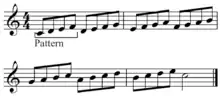"A melodic pattern is just what the name implies: a melody with some sort of fixed pattern to it."[6] "The strong theme or motive is stated. It is repeated more or less exactly, but at a different pitch level."[7]