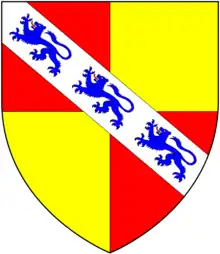 Arms of Perry of Water: Quarterly gules and or, on a bend argent three lions passant azure[3]