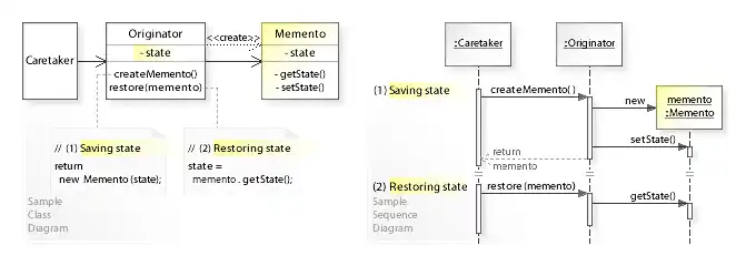- ↑ "The Memento design pattern - Structure and Collaboration". w3sDesign.com. Retrieved 2017-08-12.