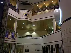 On the first floor are located the main and auxiliary lobbies, restrooms, gymnastics training area, and athletic department offices. The Varsity K Hall of Fame is located outside the southern arena doors. There is also a display showing all the donors who have endowed scholarships to athletics. The main lobby is three stories high and was built as part of the 1992 renovations on what was originally the swimming pool. It includes an elevator, concession stands, the ticket office, team shop, the Laing and Saundra Kennedy Blue and Gold Trophy Room, and the Scolin MacLean Donor's Lounge which houses the offices of The Golden Flashes Club. The four auxiliary lobbies are located at each corner of the arena and provide access to restrooms, drinking fountains, and stairs to the balcony sections.