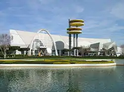 The initial storyline developed for the attraction would have seen riders enter a replica of the Orlando International Airport, before being ushered onto people movers taking them to the underground to the MIB training facility. However, executives were unsure of the concept and instead wanted at least one recognisable item from the 1997 film to be on the outside facade. Responding to the concern, designers chose the film's flying saucer-shaped towers, adding elements of the New York State Pavilion from the 1964 World's Fair, Dodgers Stadium, and the St. Louis Arch to form the facade.[7][17] Other elements of the storyline also did not make the final cut. The immigration office from the film is featured in the attraction's queue; however, it was intended that it would feature numerous animatronics. However, due to the large animatronics budget for the ride itself, this idea was scrapped. In homage, ride employees for the first few months of the ride's operation would take their breaks in the room, to give the effect of a working office.[17]