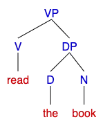 In this tree, the verb "read" is the head selecting the DP "the book", which makes the constituent a VP.