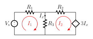 A dependent source is a current source or voltage source that depends on the voltage or current of another element in the circuit. When a dependent source is contained within an essential mesh, the dependent source should be treated like an independent source. After the mesh equation is formed, a dependent source equation is needed. This equation is generally called a constraint equation. This is an equation that relates the dependent source’s variable to the voltage or current that the source depends on in the circuit. The following is a simple example of a dependent source.[2]