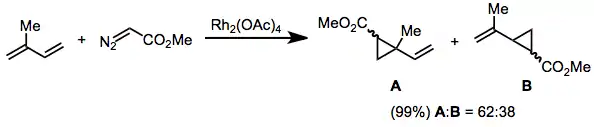 Vinyl diazoacetates react with dienes to afford divinyl cyclopropanes, which undergo Cope rearrangement to afford cycloheptadienes.[19] The more substituted double bond of the diene reacts preferentially.[20]