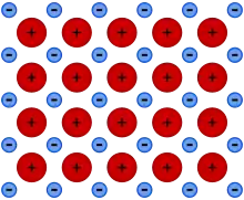 An example showing metallic bonding. + represents cations, - represents the free floating electrons.
