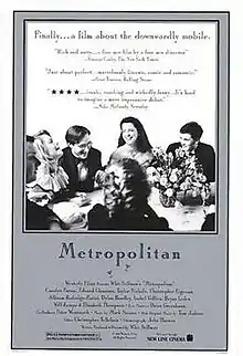 Metropolitan is a 1990 American romantic comedy-drama film produced, written and directed by Whit Stillman, in his feature directorial debut. The film concerns the lives of a group of wealthy young socialites during debutante season in Manhattan. In addition to some of their debutante parties, it covers their frequent informal after-hours gatherings at a friend's Upper East Side apartment, where they discuss life, philosophy and their fate; form attachments, romances and intrigues; and react to an interesting but less well-to-do newcomer.