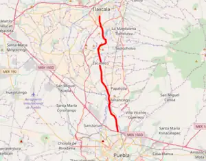 Federal Highway 119 (Carretera Federal 119) is a Federal Highway of Mexico.[3] Federal Highway 119 is split into two segments: the first segment travels from Tejocotal, Hidalgo in the north to Apizaco, Tlaxcala in the south. The second segment travels from Tlaxcala City in the north to Puebla City in the south.