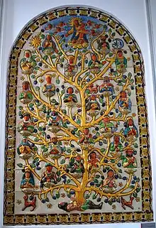 A "tree of life" (arbol de la vida) is a theme of clay sculpture created in central Mexico. The image depicted in these sculptures originally was for the teaching of the Biblical story of creation to natives in the early colonial period. The fashioning of the trees in a clay sculpture began in Izúcar de Matamoros, Puebla but today the craft is most closely identified with Metepec.[71] Traditionally, these sculptures are supposed to consist of certain biblical images, such as Adam and Eve, but other themes such as Christmas, Day of the Dead and even themes unrelated to religion are made.[70][72] Trees of life can be small or as tall as a person. The figures on the Trees of Life are made by molding and attached to the main tree figure with wires before firing. Most are painted in bright colors but there are versions painted entirely in white with gold touches and others left in their natural reddish clay color.[73]