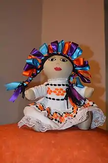 Various types of rag dolls have been made, but the most common have smiling faces, indigenous-like dress, and hair braided with ribbons. They have been called "Marias," but are more often simply called "rag dolls" (muñecas de trapo).[1] Ranging in size from three to forty five centimeters and sometimes more, the dolls can be found for sale just about anywhere in Mexico, especially in tourist venues.[2] Because of this, they have become a symbol of Mexico for foreigners and have been shipped outside of the country, primarily to the United States, Canada and South America.[3]