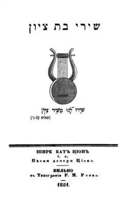 Lebensohn wrote his best known work, the poetry collection Shirei Bat-Tsiyyon ('Songs of a Daughter of Zion', published 1851, second edition 1869), in 1850. It consists of six epic poems on Jewish subjects with naturalistic description:[15] Shelomo ('Solomon'), Kohelet ('Ecclesiastes'), Nikmat Shimshon ('Samson's Vengeance'), Yael ve-Sisra ('Jael and Sisera'), Moshe al Har ha-Avarim ('Moses on Mount Abarim'), and Yehuda ha-Levi ('Judah Halevi').[9] The best-known among them, Shelomo and Kohelet, contrast the optimism of a young King Solomon with the disillusionment of the monarch in his old age.[16][17]