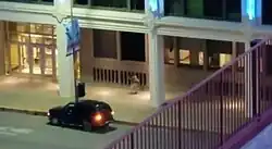 Johnson, now injured during the firefight, attempted to enter the Lamar Street entrance of the college by shooting out the glass door but was unable to make his way in.[15] He wounded two campus police officers who were near the doorway inside the building. Corporal Bryan Shaw was shot in the stomach underneath his bulletproof vest, while Officer John Abbott was hit by flying glass in the legs.[22] Johnson then made his way to Elm Street where he shot out another glass door and entered the college unseen; he then made his way to Building B.[23] Hearing the shattering glass, one of the injured campus officers, Corporal Shaw, made his way through the building and discovered a trail of blood leading to a stairwell. Accompanied by another police officer, Shaw entered the stairwell and was met with a hail of gunfire coming from above. Unable to see Johnson, he held his fire and retreated with the other officer.[15][24]