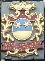 Michelstadt was granted these arms in 1541 along with its new seal by Count Georg of Erbach. The diapering in the lower half of the escutcheon is unhistoric, and only appeared in the 17th century. Indeed, the escutcheon on the Town Hall, pictured in this article, does not show it. The mullets (six-pointed star shapes) come from the Counts' arms, but why the parting per fess (horizontal division across the middle) was chosen is a mystery. Except for diapering, the arms have not changed since the 16th century.[6]