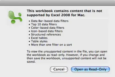 Error message in Microsoft Excel showing features that are not supported