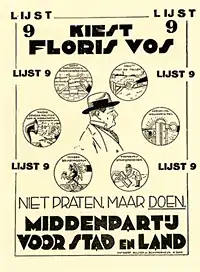 The Middle Party entered in the 1929 elections, who held a personality-based campaign around the Bussum milk industrial and anti-toll campaigner Floris Vos. The Middle Party was able to win one seat in the House of Representatives. The party played a marginal role in parliament. Vos came into conflict with Staalman over his support for a law on mandatory closing times for shops. The party consequently fell apart in parties around Staalman and Vos, who fought legal battles over the ownership of the party's name. Neither party entered in the 1933 election.