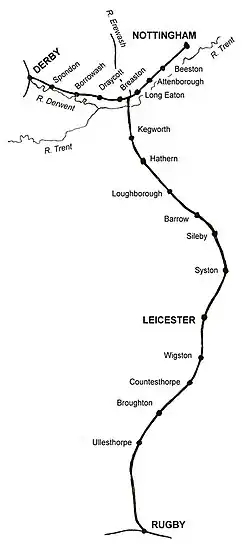 The part of the MCR line between Nottingham, Derby and Leicester is still in use as part of the Midland Main Line, the part of the route from Leicester to Rugby however was closed in the 1960s.
