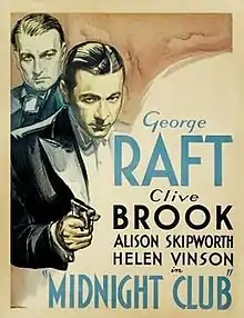 Midnight Club is a 1933 American pre-Code crime drama film about a gang of London jewel thieves infiltrated by an undercover agent (George Raft). The film was directed by Alexander Hall and George Somnes.[2][3] Produced and distributed by Paramount Pictures it is based on the 1931 short story Gangster's Glory by E. Phillips Oppenheim.