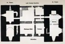 Howgill Castle is a fortified manor house lying approximately 1 km to the east of the main village and at a slightly higher elevation. Butterworth[8] believes that it dates from about 1340. It is defended to the north west by a deep ravine and commands extensive views. The original structure is more or less completely disguised by substantial 17th century modifications, but within the unremarkable shell created by this later work lie two three-storey towers, each 64 feet by 33 feet with walls about 9/10 feet thick connected by a wall over ten feet thick and over 40 feet long. This wall contains two superimposed flights of stairs providing communication between the towers. Originally, the ground floors of each tower were accessible only from the first floor. The position of the original entrance in this unusual scheme is unknown.
