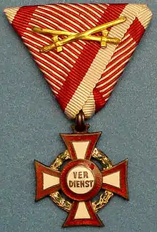 The Military Merit Cross (German: Militärverdienstkreuz, Hungarian: Katonai Érdemkereszt, Croatian: Vojni križ za zasluge)[1] was a decoration of the Empire of Austria and, after the establishment of the Dual Monarchy in 1867, the Empire of Austria-Hungary. It was first established on October 22, 1849 and underwent several revisions to its design and award criteria over the years of its existence. It became obsolete in 1918 with the dissolution of the Austro-Hungarian Empire.