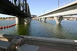 In 1999 the dry river bed was transformed into a dammed artificial lake. Tempe Town Lake was a key success to the revitalization of downtown Tempe. Formerly just a crossing over the (usually) dry river, these bridges became a centerpiece of the new lake. This prompted a lot of development along the lake. Today, mid-rise offices rise above the southeast portion of the bridges.
