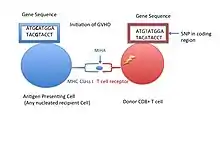 A single nucleotide change (SNP) in the coding region of the recipient is polymorphic or different from the amino acid sequence of a donor's T cell. The T cell receptor specific for peptide and MHC molecule; therefore, recognizes the self-peptide bound to the groove of HLA matched gene as foreign and initiates an immune response. The donor's CD8+ T cell targets the recipient’s nucleated cell resulting in graft-versus-host disease.