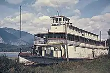 C.P.R. had no use for Minto, and sold her to the city of Nakusp for $1, with the original objective of converting her into a museum. This plan never materialized, and in April 1956, she was sold to a Nelson junk dealer for $750. The junker stripped everything out of Minto, furniture, boilers, engines and even the paddlewheel. There was nothing left except the hull and the empty cabins and pilot house. John Nelson, who had not much money, still wanted to do what he could to save Minto, so he bought what was left of her for $800 and had her towed to his farm up on the lake by Galena Bay. He had her beached, and did what he could to restore her, but because of his age and limited funds, he could not make much headway towards restoration of the vessel.[4]