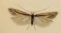 The wingspan is 6–7.5 mm for males and 5.5–7.5 mm for females. The head is cream to light brown. The forewings are mottled brown, mixed with cream or light brown in the apical third and occasionally also in the posterior third.[2] Adults are on wing from July to November in Europe, but have also been recorded in February in North Africa.