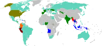 Contestants from sixty-nine countries and territories were selected to compete in the competition. Forty-three of these were selected through their respective national pageants, four were appointed having being runners-up in their national pageant, or were selected through a casting process, twenty-three were appointed to the title without participating in any national pageant.[16][17][18][19][20][21][22] The original representatives of Ecuador, India, Portugal, and Trinidad and Tobago were unable to compete for various reasons, which caused their national directors to promote the runners-up to the title or assign other participants as replacements.[23][19][24][25]
